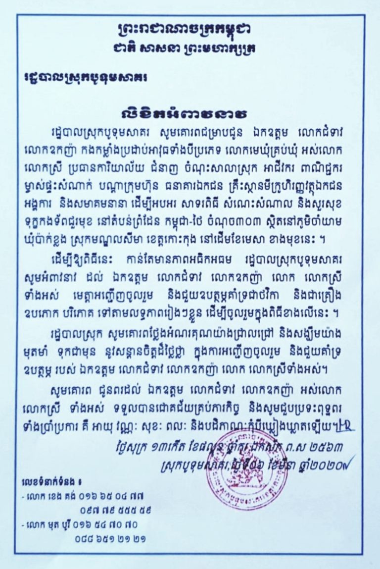 លិខិតអំពាវនាវ របស់រដ្ឋបាលស្រុកបូទុមសាគរ