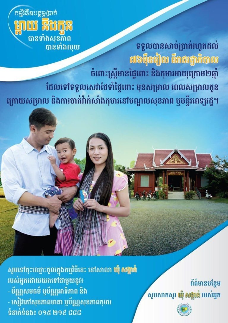 កម្មវិធីឧបត្ថម្ភប្រាក់ម្តាយ និងកូន បានទាំងសុខភាព បានទាំងលុយ ទទួលបានសាច់ប្រាក់រហូតដល់ ៧៦ ម៉ឺនរៀល ពីរាជរដ្ឋាភិបាល ចំពោះស្ត្រីមានផ្ទៃពោះ និងកុមារអាយុក្រោម២ឆ្នាំ។