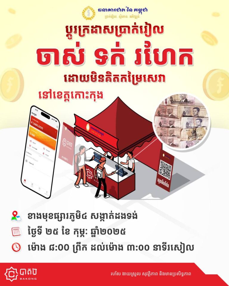 សេចក្តីជូនដំណឹង ស្តីពីកម្មវិធីប្តូរក្រដាសប្រាក់រៀលចាស់ ទក់ រហែក នៅខេត្តកោះកុង សម្រាប់ខែ ខែកុម្ភៈឆ្នាំ ២០២៥