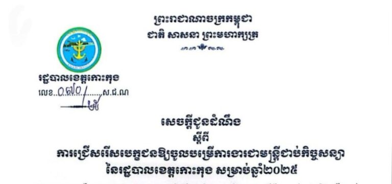 សេចក្តីជូនដំណឹង ស្តីពីការជ្រើសរើសបេក្ខជនឱ្យចូលបម្រើការងារជាមន្ត្រីជាប់កិច្ចសន្យា នៃរដ្ឋបាលខេត្តកោះកុង សម្រាប់ឆ្នាំ២០២៥