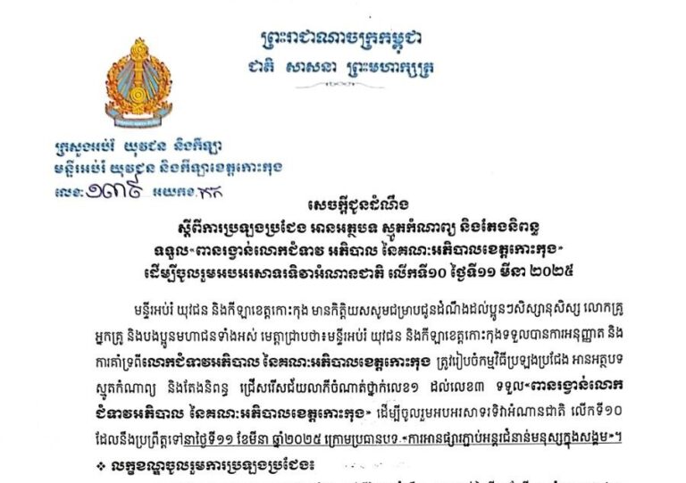 សេចក្តីជូនដំណឹង៖ ស្តីពីការប្រឡងប្រជែង អានអត្ថបទ ស្មូតកំណាព្យ និងតែងនិពន្ធ ទទួល “ពានរង្វាន់លោកជំទាវ អភិបាល នៃគណៈអភិបាលខេត្តកោះកុង” ដើម្បីចូលរួមអបអរសាទរទិវាអំណានជាតិ លើកទី១០ ថ្ងៃទី១១ មីនា ២០២៥