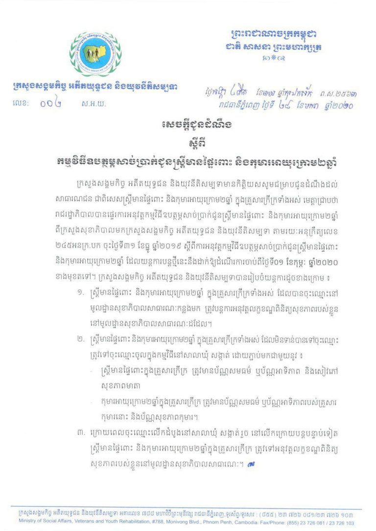 សេចក្តីជូនដំណឹង ស្តីពីកម្មវិធីឧបត្ថម្ភសាច់ប្រាក់ជូនស្ត្រីមានផ្ទៃពោះ និងកុមារអាយុក្រោម២ឆ្នាំ