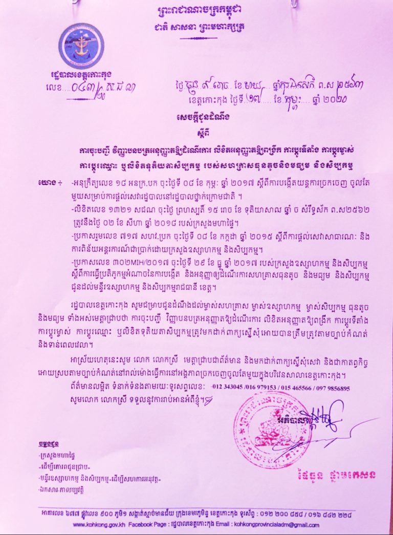 សេចក្តីជូនដំណឹង របស់រដ្ឋបាលខេត្តកោះកុង ស្ដីពីការចុះបញ្ជី វិញ្ញាបនបត្រអនុញ្ញាតឲ្យដំណើរការ លិខិតអនុញ្ញាតឱ្យពង្រីក ការប្ដូរទីតាំង ការប្ដូរម្ចាស់ ការប្ដូរឈ្មោះ ឬលិខិតទុតិយតាសិប្បកម្ម របស់សហគ្រាសធុនតូចនិងមធ្យម និងសិប្បកម្ម