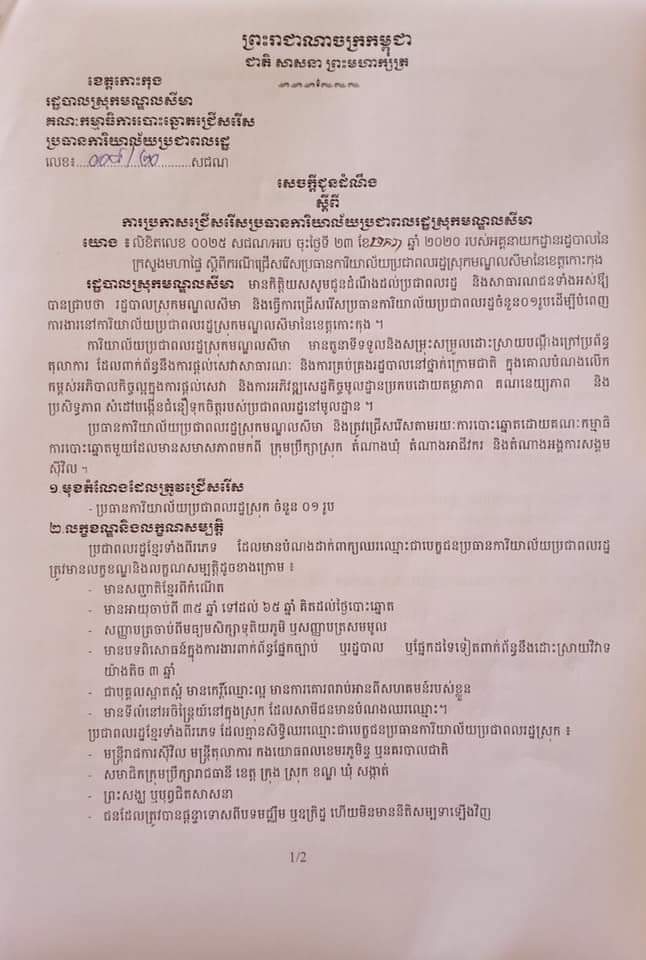 សេចក្តីជូនដំណឹង ស្តីពីការប្រកាសជ្រើសរើសប្រធានការិយាល័យប្រជាពលរដ្ឋ ស្រុកមណ្ឌលសីមា។