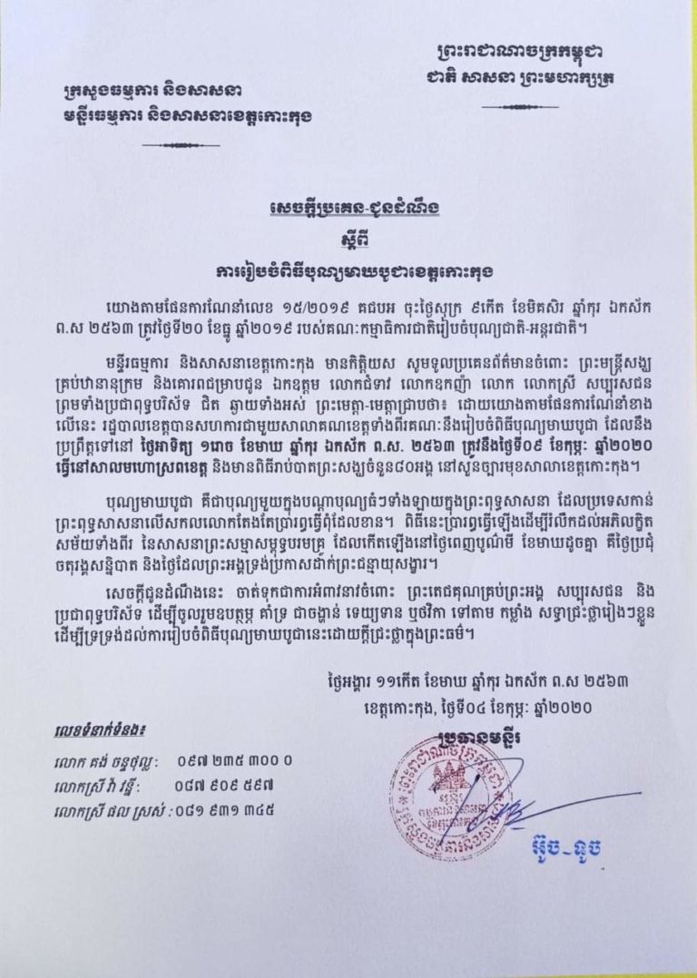 សេចក្តីប្រគេន និងជូនដំណឹង ស្តីពីការរៀបចំពិធីបុណ្យមាឃបូជា ខេត្តកោះកុង