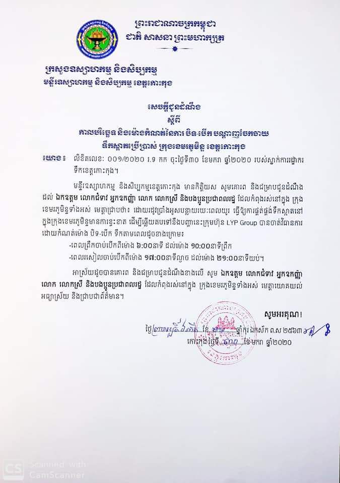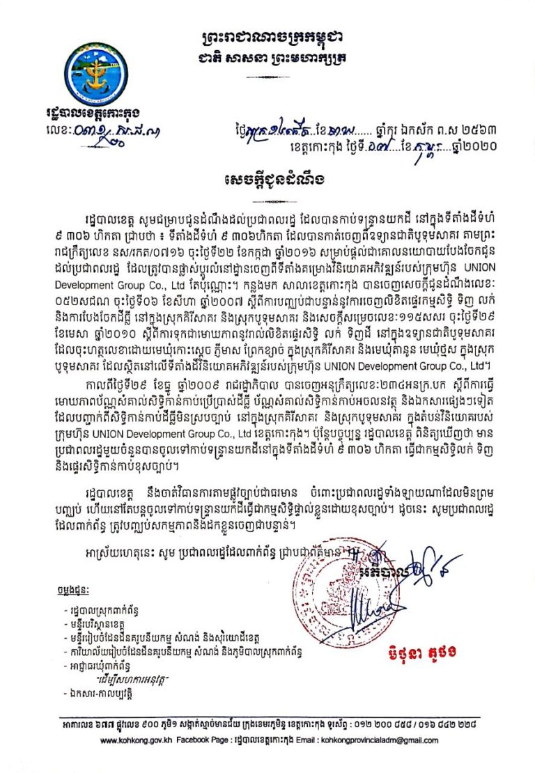 សេចក្តីជូនដំណឹងរបស់រដ្ឋបាលខេត្តកោះកុង
