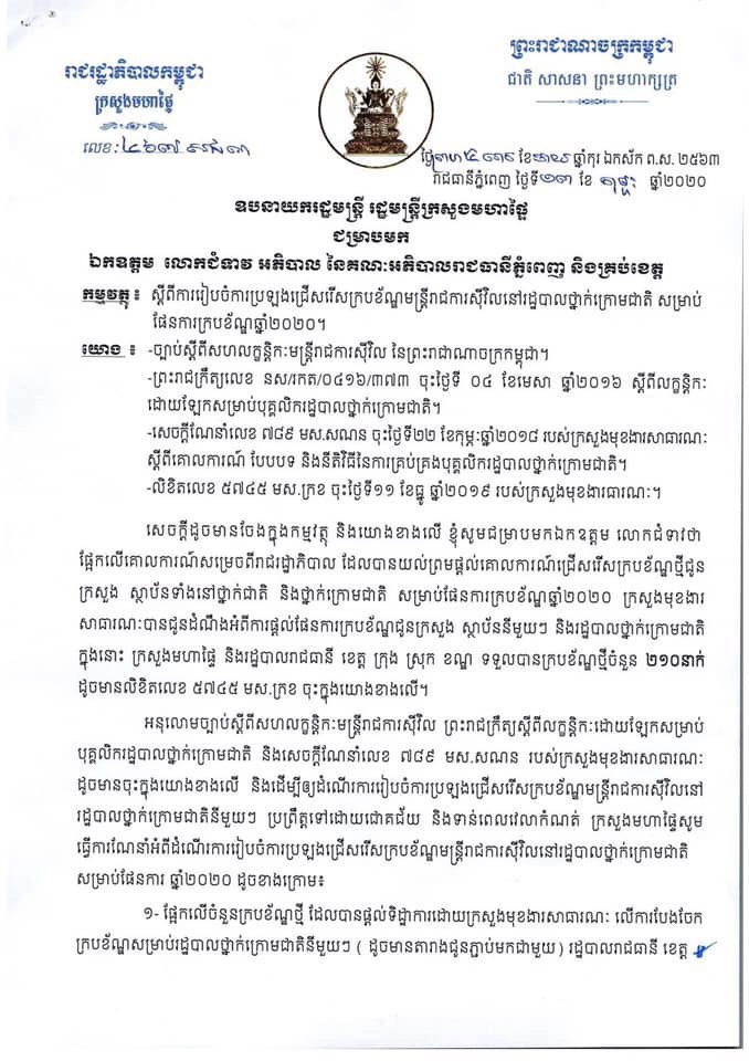 សេចក្តីជូនដំណឹង ស្តីពីការរៀបចំការប្រឡងជ្រើសរើសក្របខ័ណ្ឌមន្ត្រីរាជការស៉ីវិល នៅរដ្ឋបាលថ្នាក់ក្រោមជាតិ សម្រាប់ផែនការក្របខ័ណ្ឌ ឆ្នាំ២០២០