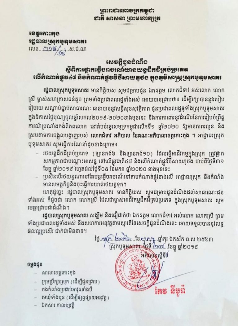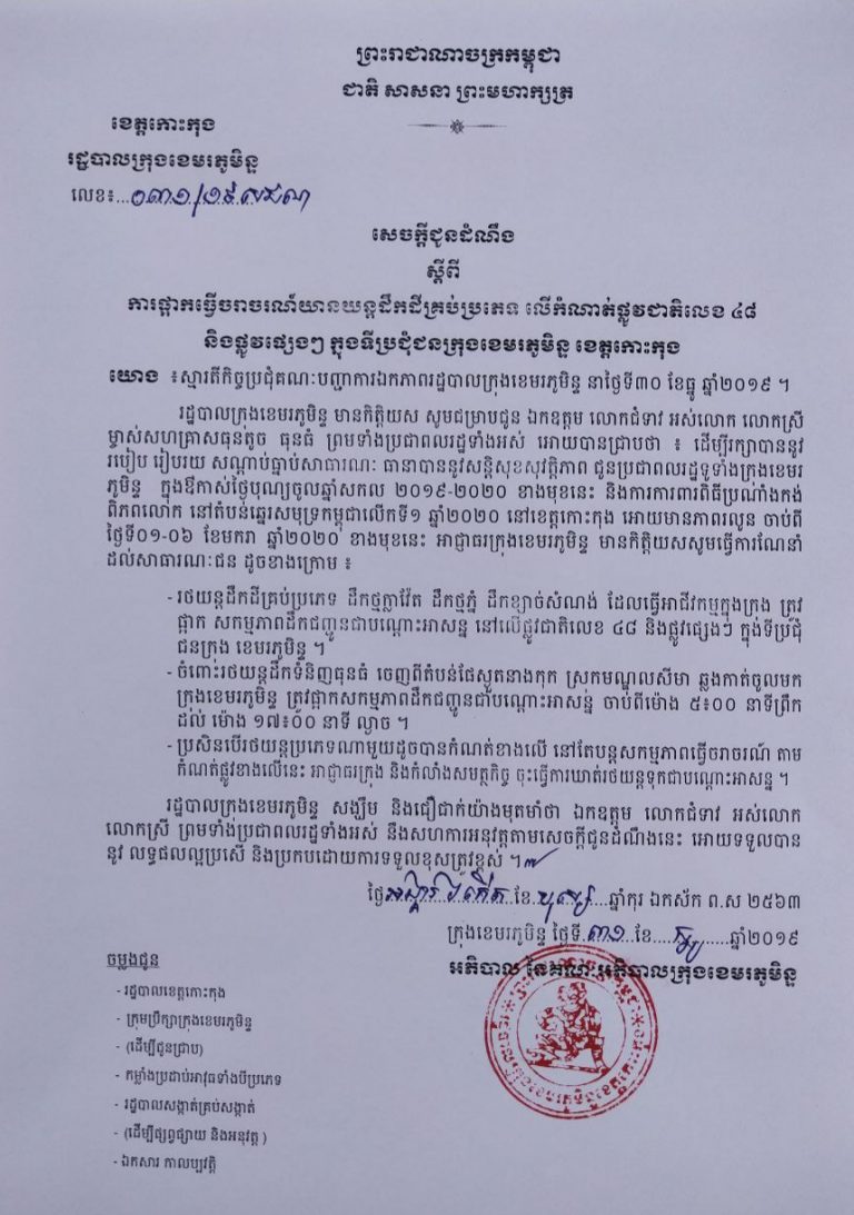 សេចក្តីជូនដំណឹង ស្តីពីកាប៉ាចរាចរណ៍យានយន្តដឹកដីគ្រប់ប្រភេទ លើកំណាត់ផ្លូវជាតិលេខ ៤៨ និងផ្លូវផ្សេងៗ ក្នុងទីប្រជុំជនក្រុងខេមរភូមិន្ទ ខេត្តកោះកុង