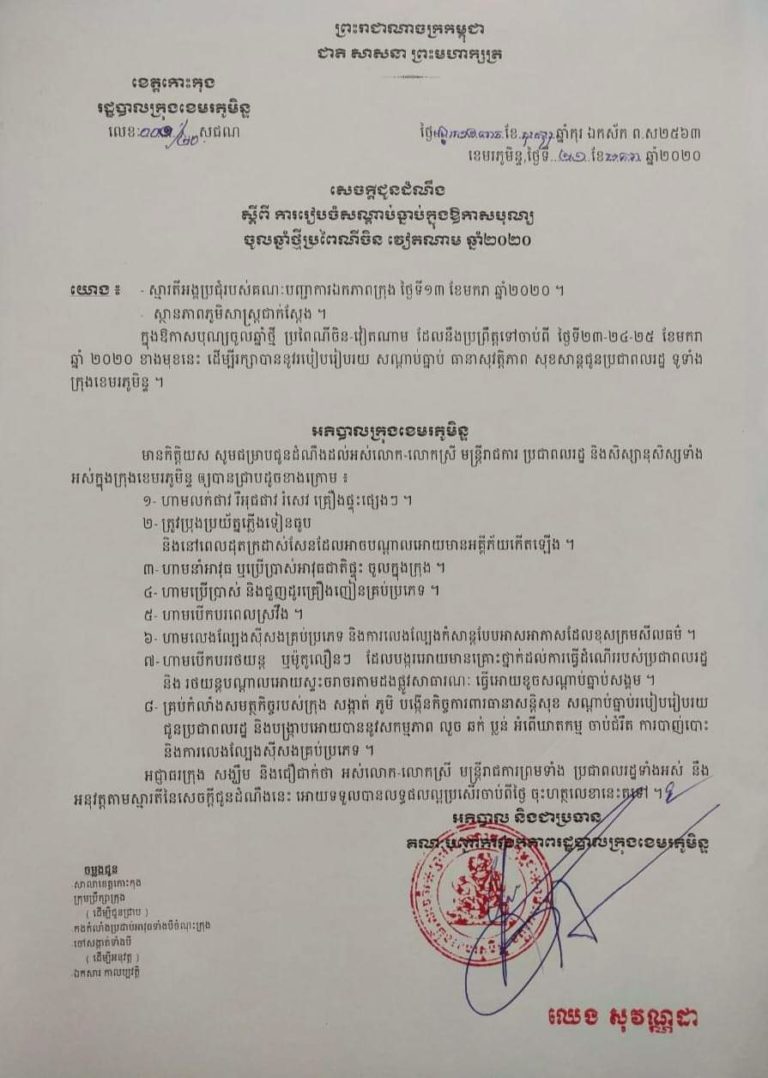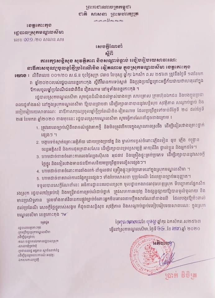 សេចក្តីជូនដំណឹង ស្តីពីការរក្សាសន្តិសុខ សុវត្ថិភាព និងសណ្តាប់ធ្នាប់ របៀបរៀបរយសាធារណៈ នាឱកាសបុណ្យចូលឆ្នាំថ្មីប្រពៃណីចិន វៀតណាម ក្នុងស្រុកមណ្ឌលសីមា ខេត្តកោះកុង