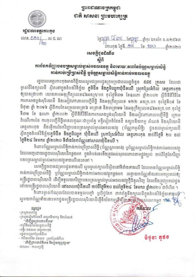 សេចក្តីជូនដំណឹង ស្តីពី ការចែកវិញ្ញាបនបត្រសម្គាល់ម្ចាស់ អចលនវត្ថុ និងមោឃៈភាព នៃប័ណ្ណសម្គាល់សិទ្ធិកាន់កាប់ប្រើ ប្រាស់ដីធ្លី ឫប័ណ្ណសម្គាល់សិទ្ធិកាន់កាប់អចលនវត្ថុ នៅភូមិជីខ និងភូមិឈូក ឃុំជីខលើ ស្រុកស្រែអំបិល ខេត្តកោះកុង ចាប់ពីថ្ងៃទី២០ ដល់ថ្ងៃទី២៤ ខែមករា ឆ្នាំ២០២០ នៅសាលាឃុំជីខលើ