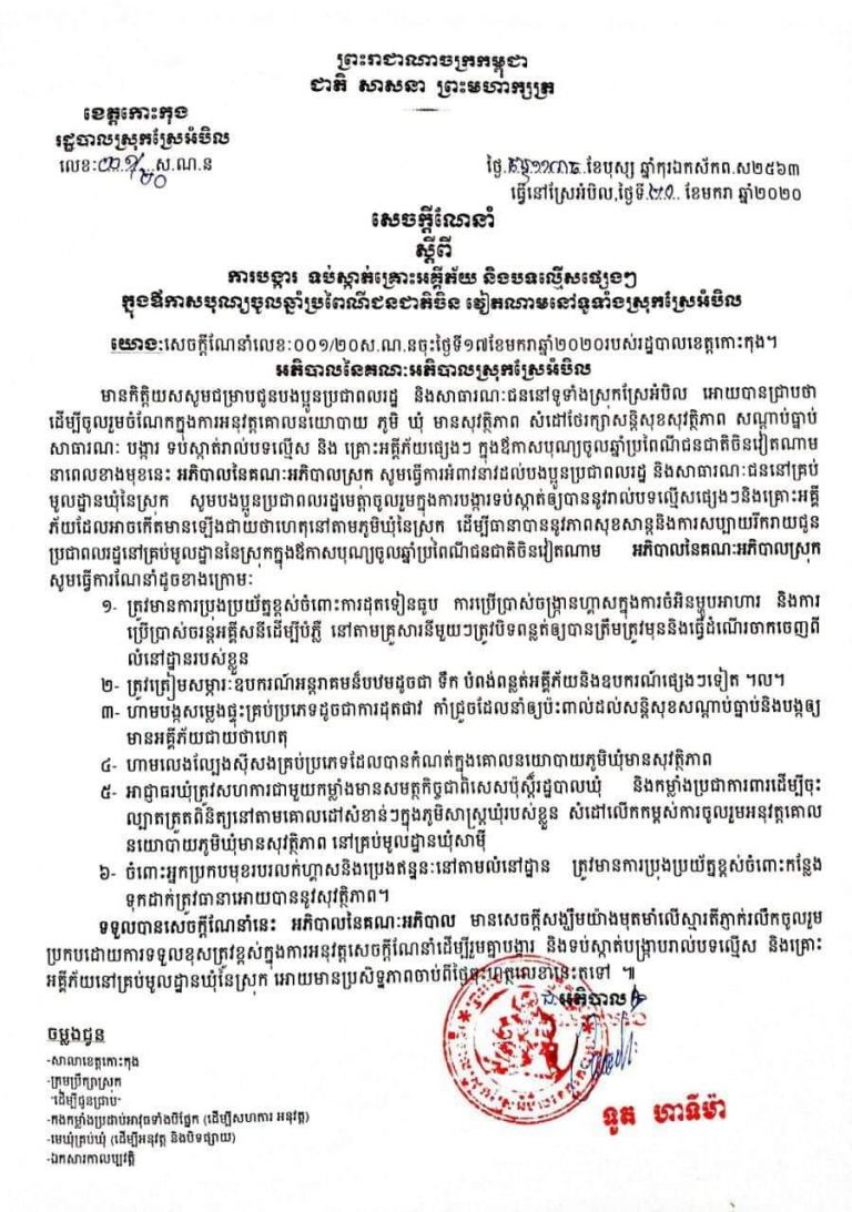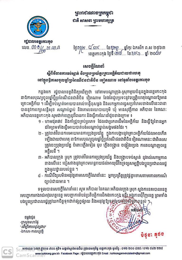 សេចក្តីណែនាំ ស្តីពីវិធានការទប់ស្កាត់ និងប្រុងប្រយ័ត្នគ្រោះអគ្គីភ័យជាយថាហេតុ នៅក្នុងឱកាសចូលឆ្នាំប្រពៃណីជនជាតិចិន វៀតណាម នៅទូទាំងខេត្តកោះកុង