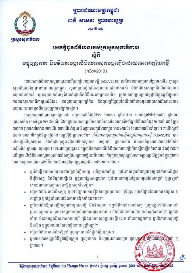 សេចក្តីជូនព័ត៌មាន របស់ក្រសួងសុខាភិបាល ស្តីពីបច្ចុប្បន្នភាព និងវិធានបង្ការជំងឺរលាកសួតបង្កឡើងដោយមេរោគកូរ៉ូណាថ្មី(nCoV2019)