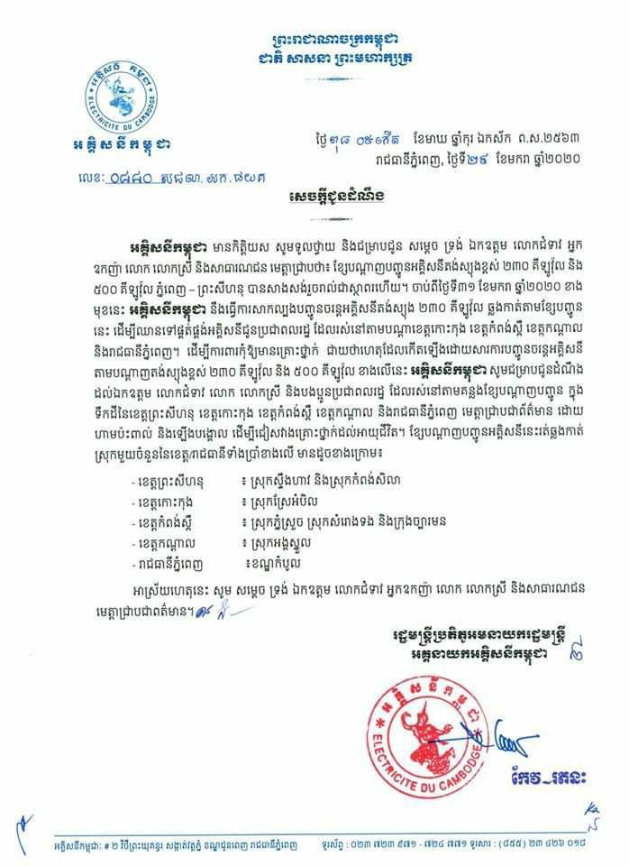 សេចក្តីជូនដំណឹង ស្ដីពីការបញ្ជូនអគ្គិសនីតង់ស្យុងខ្ពស់ ២៣០គីឡូវ៉ុល និង ៥០០គីឡូវ៉ុល