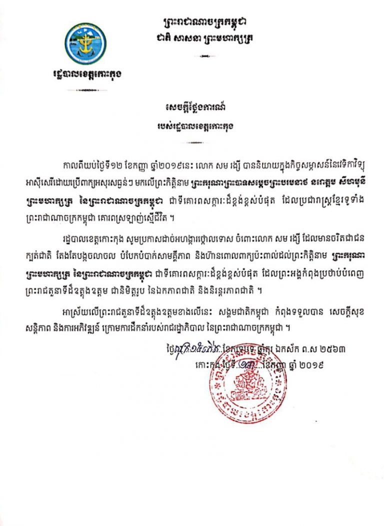 សេចក្តីថ្លែងការ របស់រដ្ឋបាលខេត្តកោះកុង
