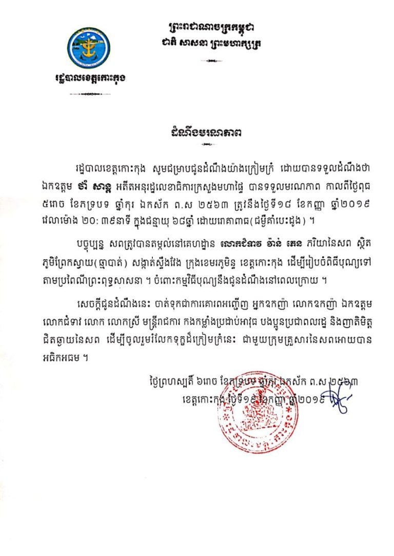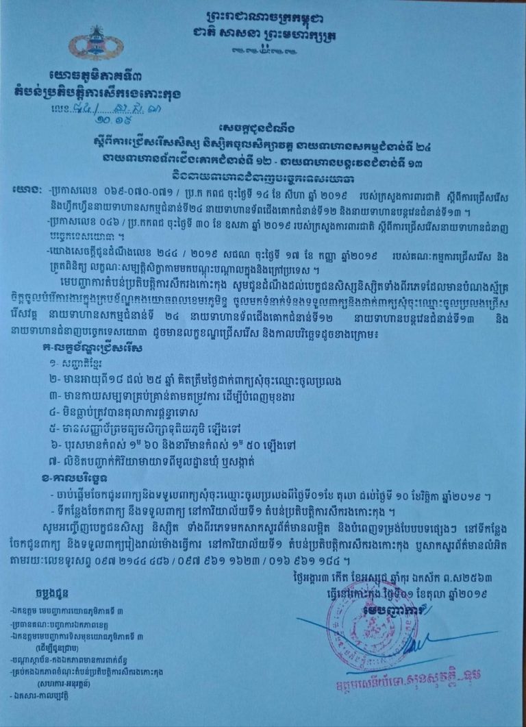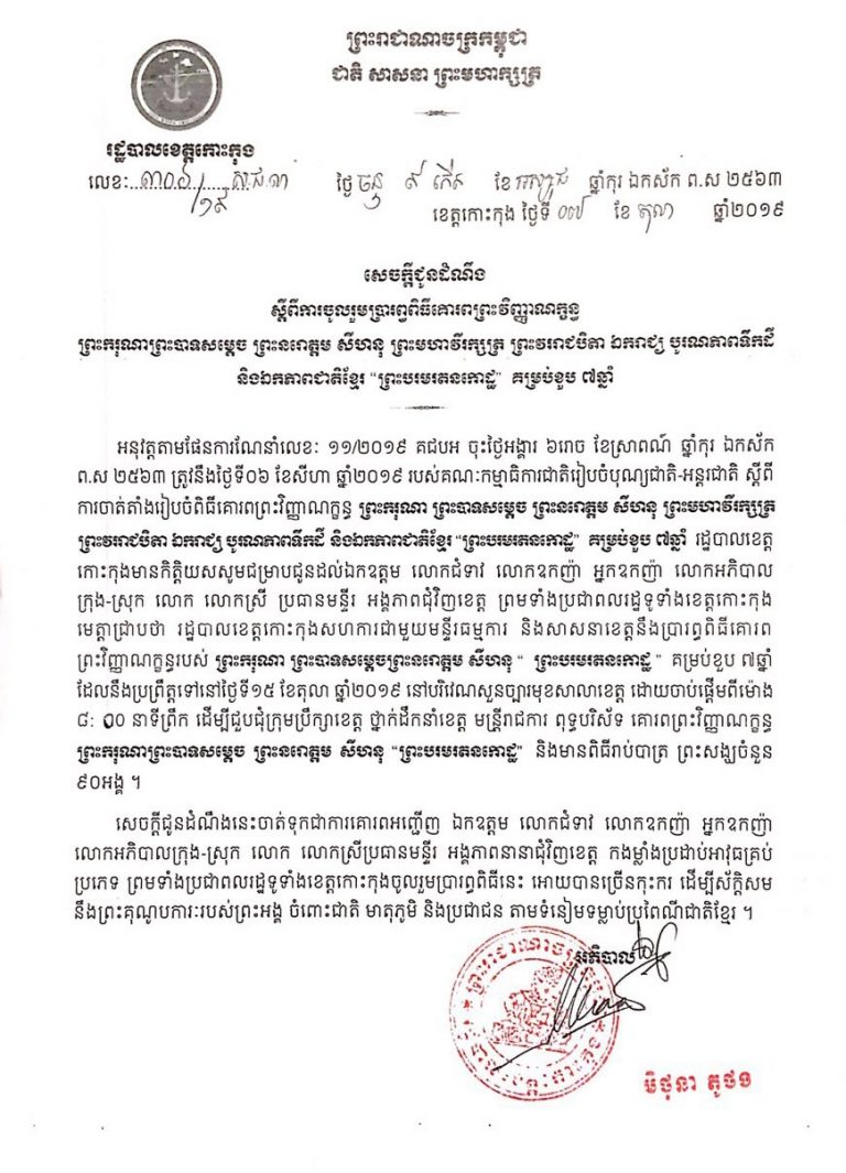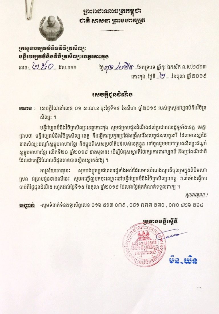 សេចក្តីជូនដំណឹង របស់រដ្ឋបាលខេត្តកោះកុង