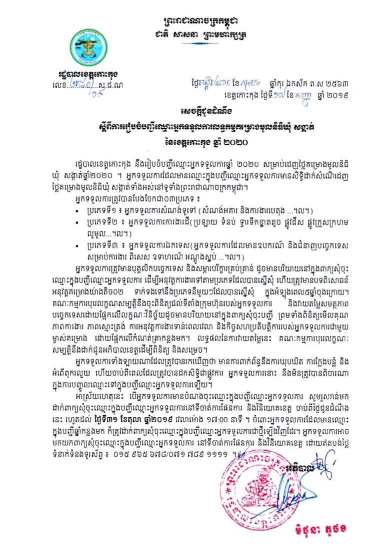 សេចក្តីជូនដំណឹង ស្ដីពីការរៀបចំបញ្ជីឈ្មោះអ្នកទទួលការលទ្ធកម្មគម្រោងមូលនិធិឃុំ សង្កាត់ នៃខេត្តកោះកុង ឆ្នាំ២០២០