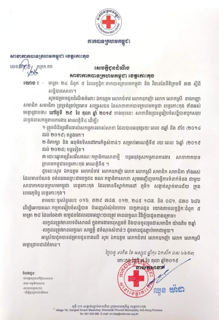 សេចក្តីជូនដំណឹង ស្តីពីការរៀបចំសន្និបាតសាខាអាណត្តិទី៥ (២០២០-២០២៥) របស់សាខាកាកបាទក្រហមកម្ពុជាខេត្តកោះកុង