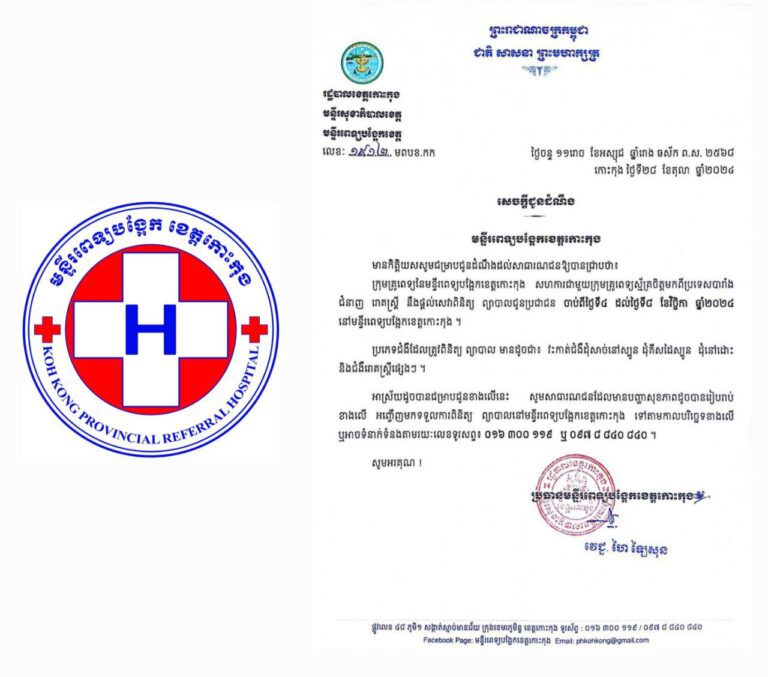 សេចក្ដីជូនដំណឹង មន្ទីរសុខាភិបាលនៃរដ្ឋបាលខេត្តកោះកុង សូមគោរពជម្រាបជូនសាធារណជន ឱ្យបានជ្រាបថា ក្រុមគ្រូពេទ្យនៃមន្ទីរពេទ្យបង្អែកខេត្តកោះកុង សហការជាមួយក្រុមគ្រូពេទ្យស្ម័គ្រចិត្តមកពីប្រទេសបារាំង ជំនាញ រោគស្ត្រី នឹងផ្តល់សេវាពិនិត្យ ព្យាបាលជូនប្រជាជន ចាប់ពីថ្ងៃទី៤ ដល់ថ្ងៃទី៨ ខែវិច្ឆិកា ឆ្នាំ២០២៤ នៅមន្ទីរពេទ្យបង្អែកខេត្តកោះកុង