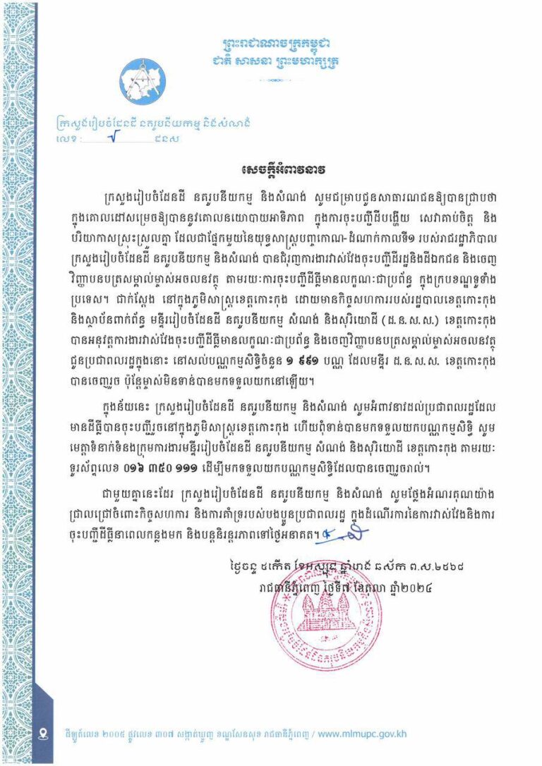 ក្រសួងរៀបចំដែនដី នគរូបនីយកម្ម និងសំណង់ សូមអំពាវនាវដល់ប្រជាពលរដ្ឋដែល មានដីធ្លីបានចុះបញ្ជីរួចនៅក្នុងភូមិសាស្ត្រខេត្តកោះកុង ហើយពុំទាន់បានមកទទួលយកបណ្ណកម្មសិទ្ធិ សូមមេត្តាទំនាក់ទំនងក្រុមការងារមន្ទីររៀបចំដែនដី នគរូបនីយកម្ម សំណង់ និងសុរិយោដី ខេត្តកោះកុង ដើម្បីមកទទួលយកបណ្ណកម្មសិទ្ធិដែលបានចេញរួចរាល់