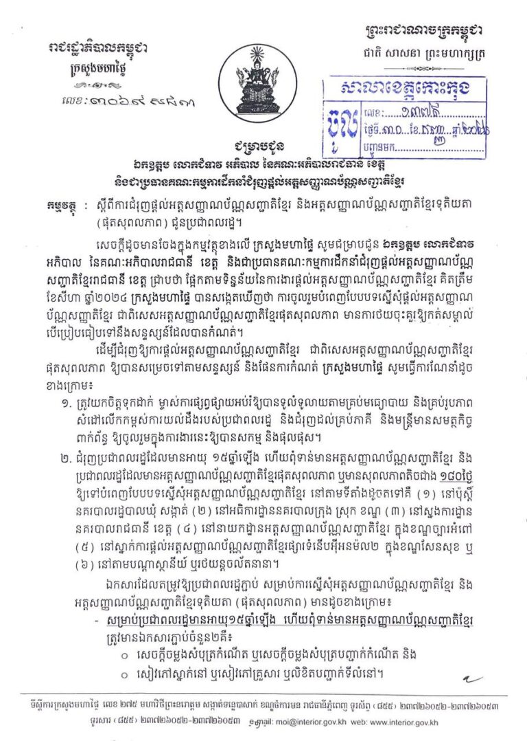 សេចក្តីជូនដំណឹង ស្តីពីការជំរុញផ្តល់អត្តសញ្ញាណប័ណ្ណសញ្ជាតិខ្មែរ និងអត្តសញ្ញាណប័ណ្ណសញ្ជាតិខ្មែរទុតិយតា (ផុតសុពលភាព) ជូនប្រជាពលរដ្ឋ