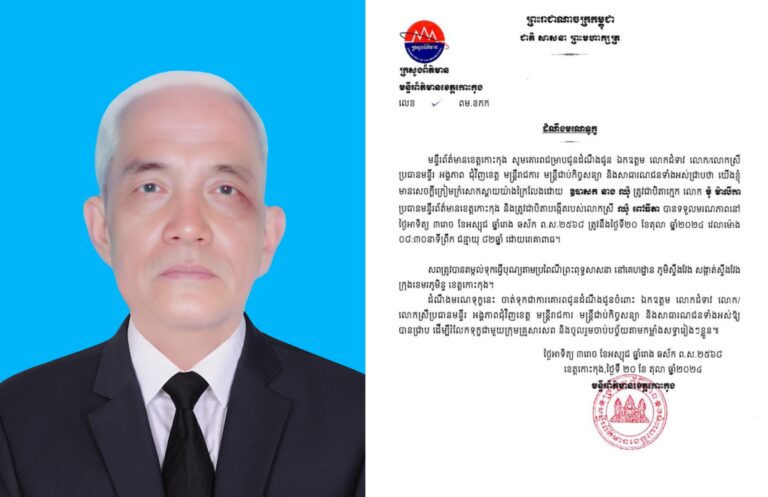 មន្ទីរព័ត៌មានខេត្តកោះកុង សូមគោរពជម្រាបជូនដំណឹងជូន ឯកឧត្តម លោកជំទាវ លោក លោកស្រី ប្រធានមន្ទីរ អង្គភាព ជុំវិញខេត្ត មន្ត្រីរាជការ មន្ត្រីជាប់កិច្ចសន្យា និងសាធារណជនទាំងអស់ជ្រាបថា យើងខ្ញុំ មានសេចក្តីក្រៀមក្រំសោកស្តាយយ៉ាងក្រៃលែងដោយ ឧបាសក នាង ឈុំ ត្រូវជាបិតាក្មេក លោក មុំ ម៉ាលីកា ប្រធានមន្ទីរព័ត៌មានខេត្តកោះកុង និងត្រូវជាបិតាបង្កើតរបស់លោកស្រី ឈុំ ពៅធីតា បានទទួលមរណភាពនៅ ថ្ងៃអាទិត្យ ៣រោច ខែអស្សុជ ឆ្នាំរោង ឆស័ក ព.ស.២៥៦៨ ត្រូវនឹងថ្ងៃទី២០ ខែតុលា ឆ្នាំ២០២៤ វេលាម៉ោង ០៨:៣០នាទីព្រឹក ជន្មាយុ ៨២ឆ្នាំ ដោយរោគាពាធ