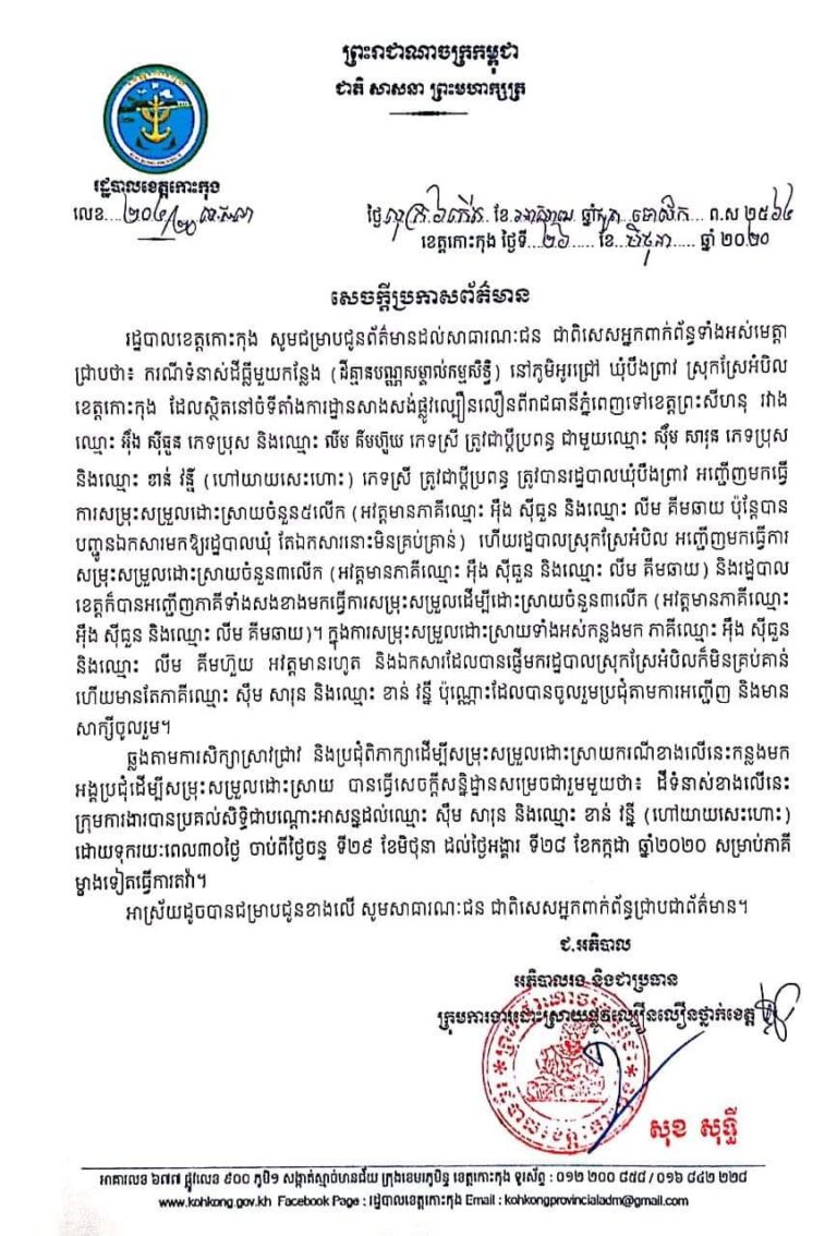 សេចក្តីប្រកាសព័ត៌មាន របស់រដ្ឋបាលខេត្តកោះកុង ស្តីពីករណីទំនាស់ដីធ្លីមួយកន្លែង (ដីគ្មានបណ្ណសម្គាល់កម្មសិទ្ធិ) នៅភូមិអូរជ្រៅ ឃុំបឹងព្រាវ ស្រុកស្រែអំបិល ខេត្តកោះកុង