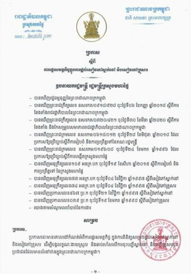ក្រសួងទេសចរណ៍ប្រកាសឱ្យអនុវត្តវិធានសុវត្ថិភាពទេសចរណ៍ និងក្រមប្រតិបត្តិសម្រាប់អាជីវកម្ម ភោជនីយដ្ឋាន-អាហារដ្ឋាន និងក្រមប្រតិបត្តិស្ដីពីវិធានសុវត្ថិភាពទេសចរណ៍សម្រាប់អាជីវកម្មភោជនីយដ្ឋាន-អាហារដ្ឋាននេះ ដើម្បីចូលរួមទប់ស្កាត់ការរីករាលដាលនៃជំងឺកូវីដ-១៩។