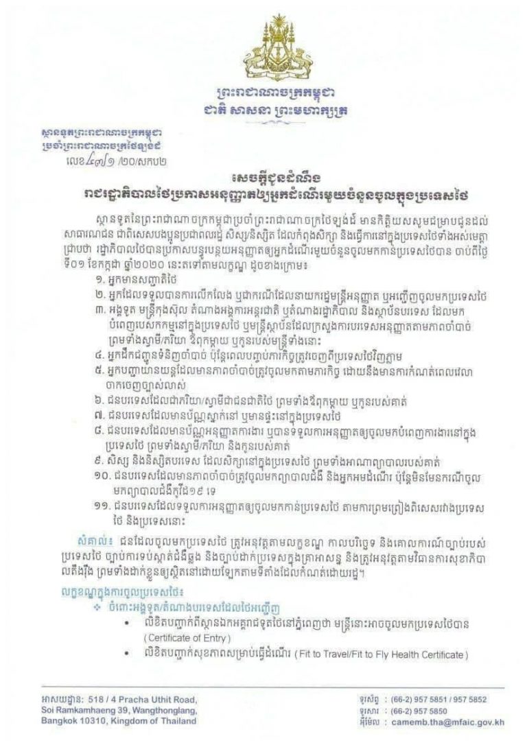 សេចក្តីជូនដំណឹង រាជរដ្ឋាភិបាល នៃប្រទេសថៃប្រកាសអនុញ្ញាតឱ្យអ្នកដំណើរមួយចំនួនចូលក្នុងប្រទេសថៃ