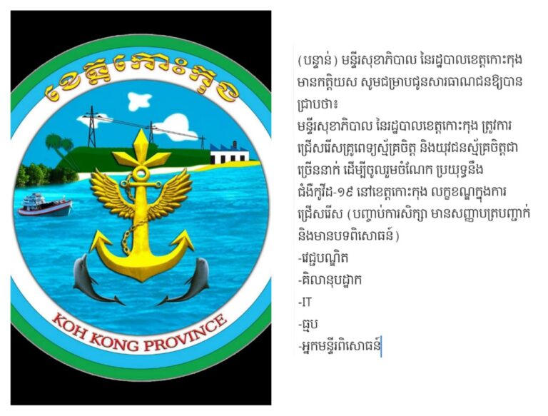 (បន្ទាន់) មន្ទីរសុខាភិបាល នៃរដ្ឋបាលខេត្តកោះកុង មានកត្តិយស សូមជម្រាបជូនសារធាណជនឱ្យបានជ្រាបថា មន្ទីរសុខាភិបាល នៃរដ្ឋបាលខេត្តកោះកុង ត្រូវការជ្រើសរើសគ្រូពេទ្យស្ម័គ្រចិត្ត និងយុវជនស្ម័គ្រចិត្តជាច្រើននាក់ ដើម្បីចូលរួមចំណែក ប្រយុទ្ធនឹងជំងឺកូវីដ-១៩ នៅខេត្តកោះកុង លក្ខខណ្ឌក្នុងការជ្រើសរើស (បញ្ចាប់ការសិក្សា មានសញ្ញាបត្របញ្ជាក់ និងមានបទពិសោធន៍)-វេជ្ជបណ្ឌិត -គិលានុបដ្ឋាក -IT -ធ្មប -អ្នកមន្ទីរពិសោធន៍ សូមទំនាក់ទំនងលេខទូរស័ព្ទ ០១២ ៧៦ ៩០ ៩០ និង ០៩៧ ៧៣២ ៦៧៣៥