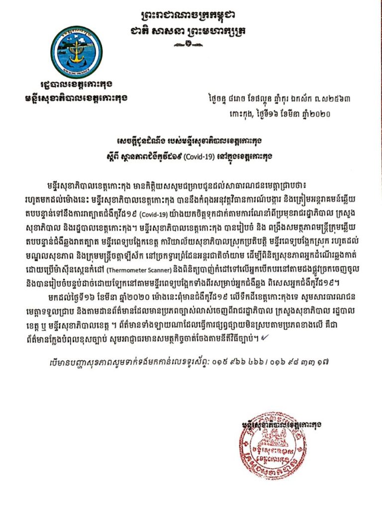 សេចក្តីជូនដំណឹង របស់មន្ទីរសុខាភិបាលកោះកុង ស្តីពីស្ថានភាពជំងឺកូវីដ១៩ (Covid-19) នៅក្នុងខេត្តកោះកុង
