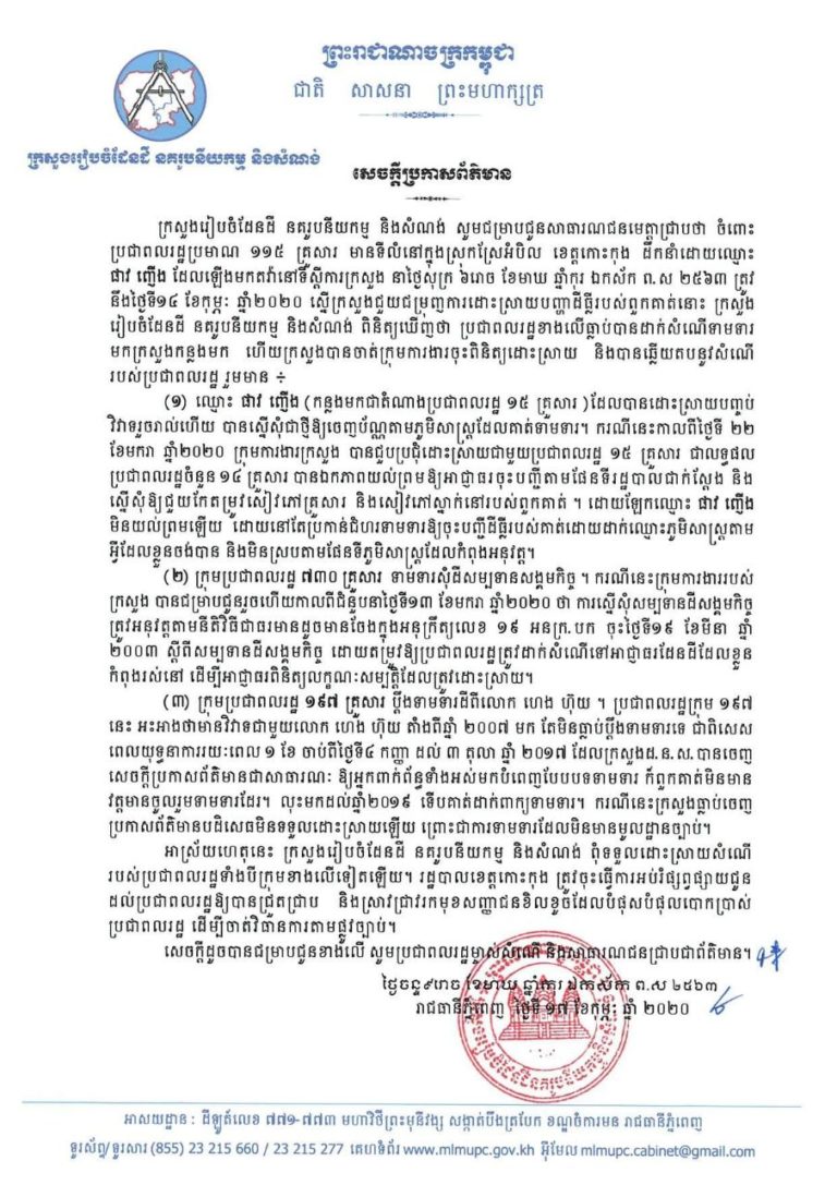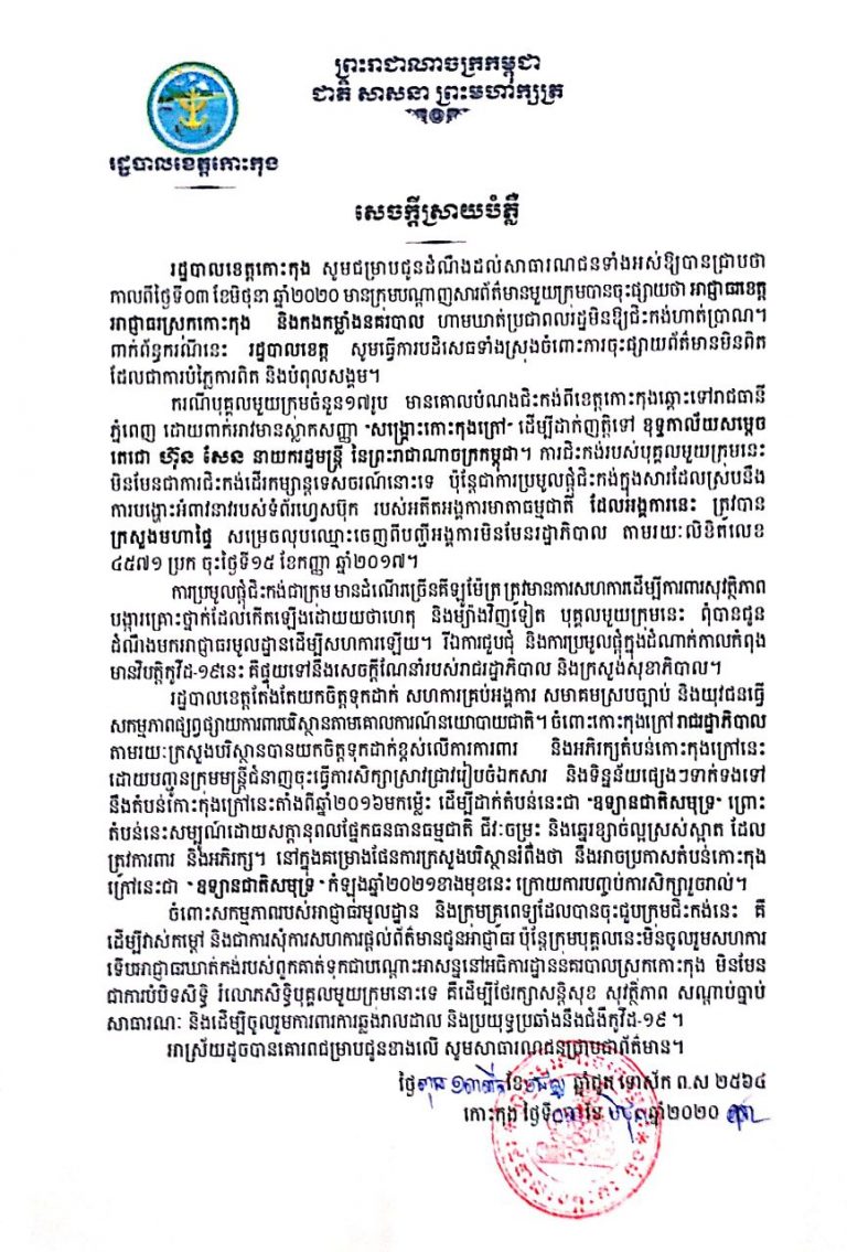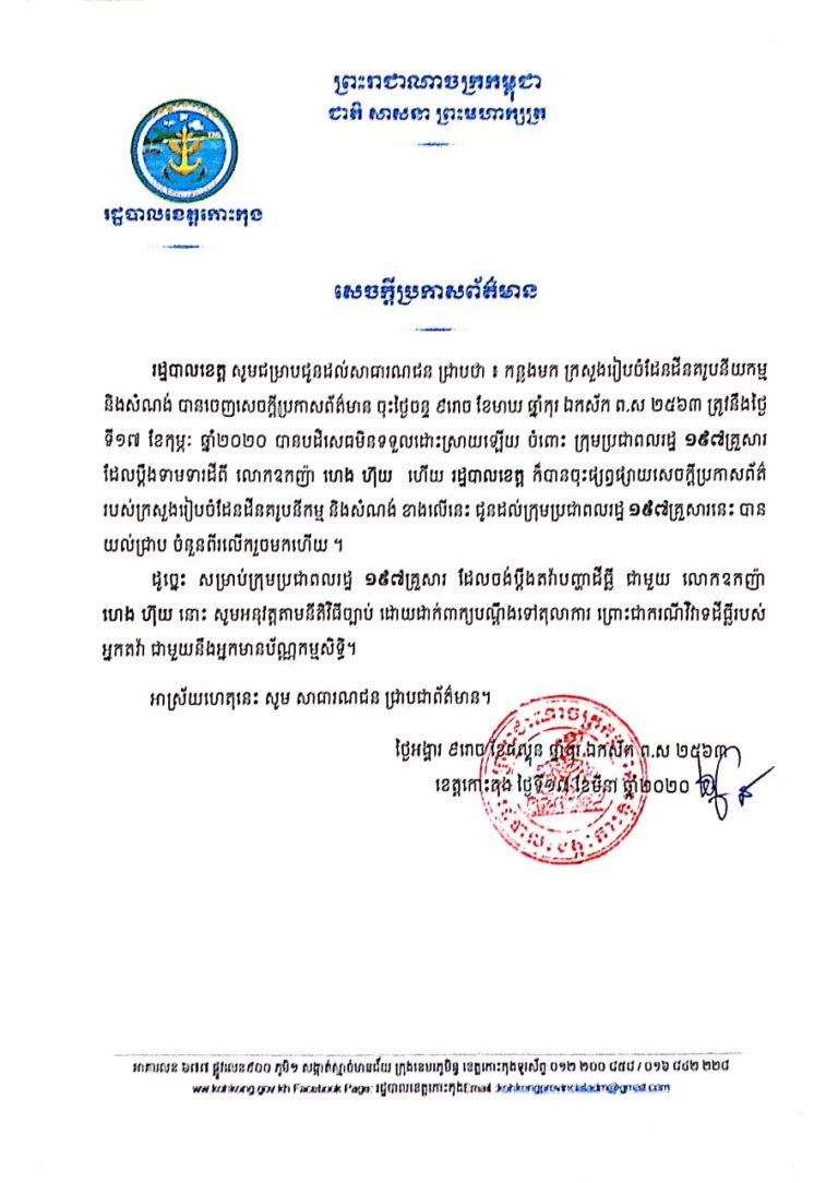 សេចក្តីប្រកាសព័ត៌មាន របស់រដ្ឋបាលខេត្តកោះកុង