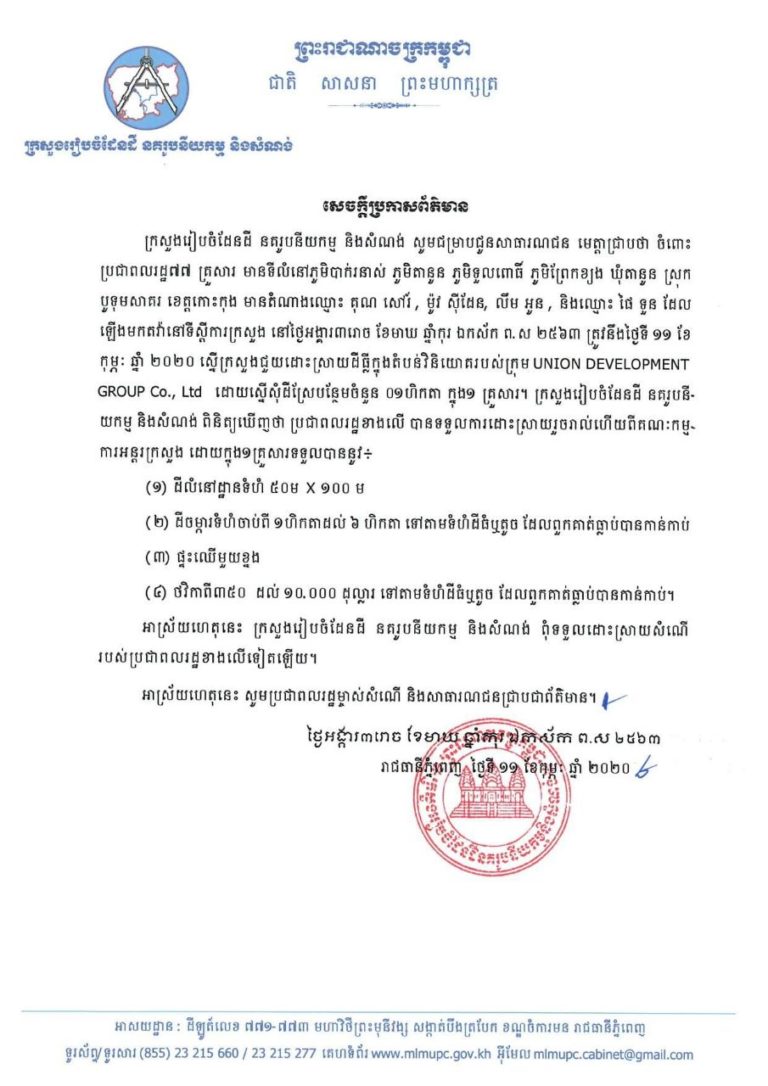 សេចក្តីប្រកាសព័ត៌មាន របស់ក្រសួងរៀបចំដែនដី នគរូបនីយកម្ម និងសំណង់