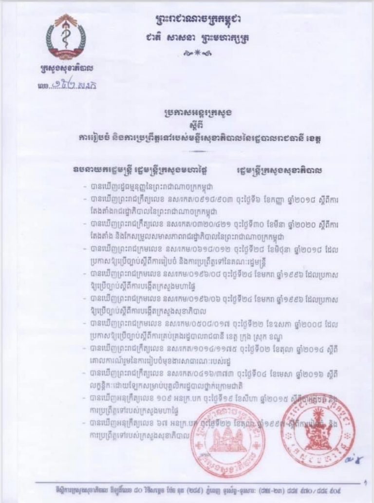 ប្រកាសអន្តរក្រសួង ស្តីពីការរៀបចំ និងប្រព្រឹត្តទៅរបស់មន្ទីរសុខាភិបាល នៃរដ្ឋបាលរាជធានី ខេត្ត