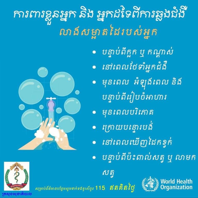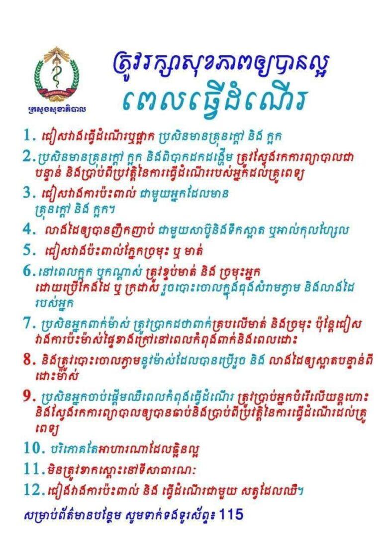 សារអប់រំ ការបង្ការចំលងមេរោគកូរ៉ូណាវីរុសប្រភេទថ្មី ពីនាយកដ្ឋានប្រយុទ្ធនឹងជំងឺឆ្លង នៃក្រសួងសុខាភិបាល។ ព័ត៌មានបន្ថែម : ១១៥ មិនគិតថ្លៃពីគ្រប់ប្រព័ន្ទ