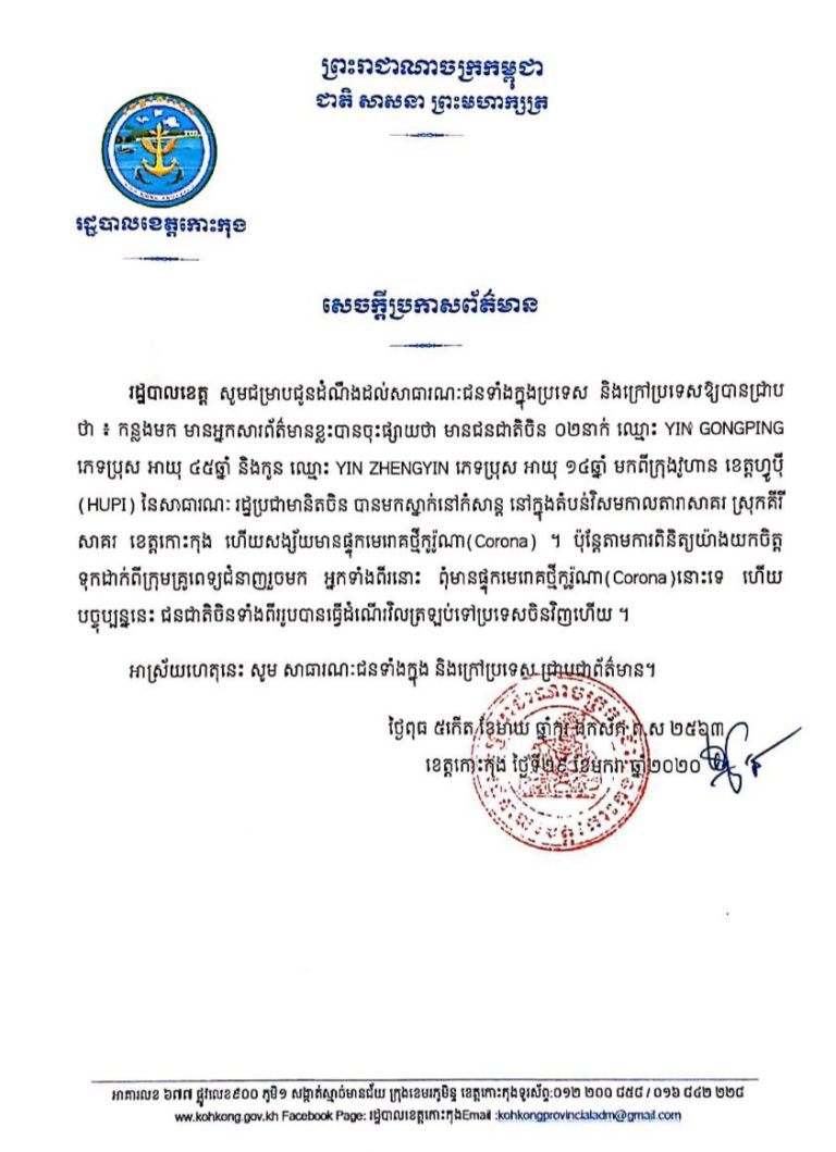 សេចក្តីប្រកាសព័ត៌មាន របស់រដ្ឋបាលខេត្តកោះកុង