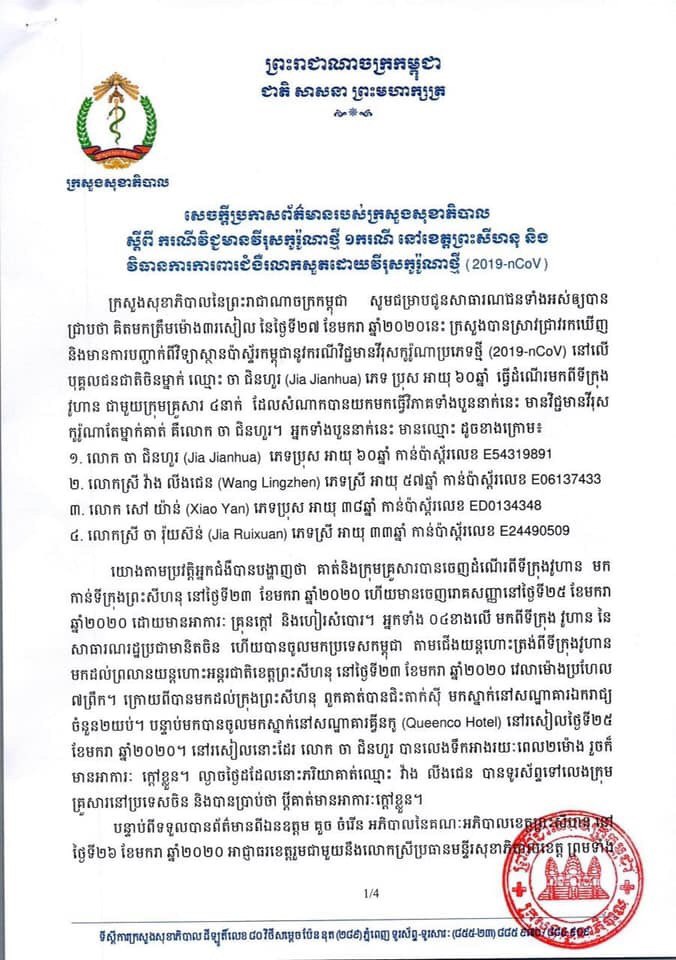 សេចក្តីប្រកាសព័ត៌មានស្តីពីការរកឃេីញមួយករណីជំងឺរលាកសួតដោយវីរុសកូរ៉ូណាថ្មី នៅខេត្តព្រះសីហនុ