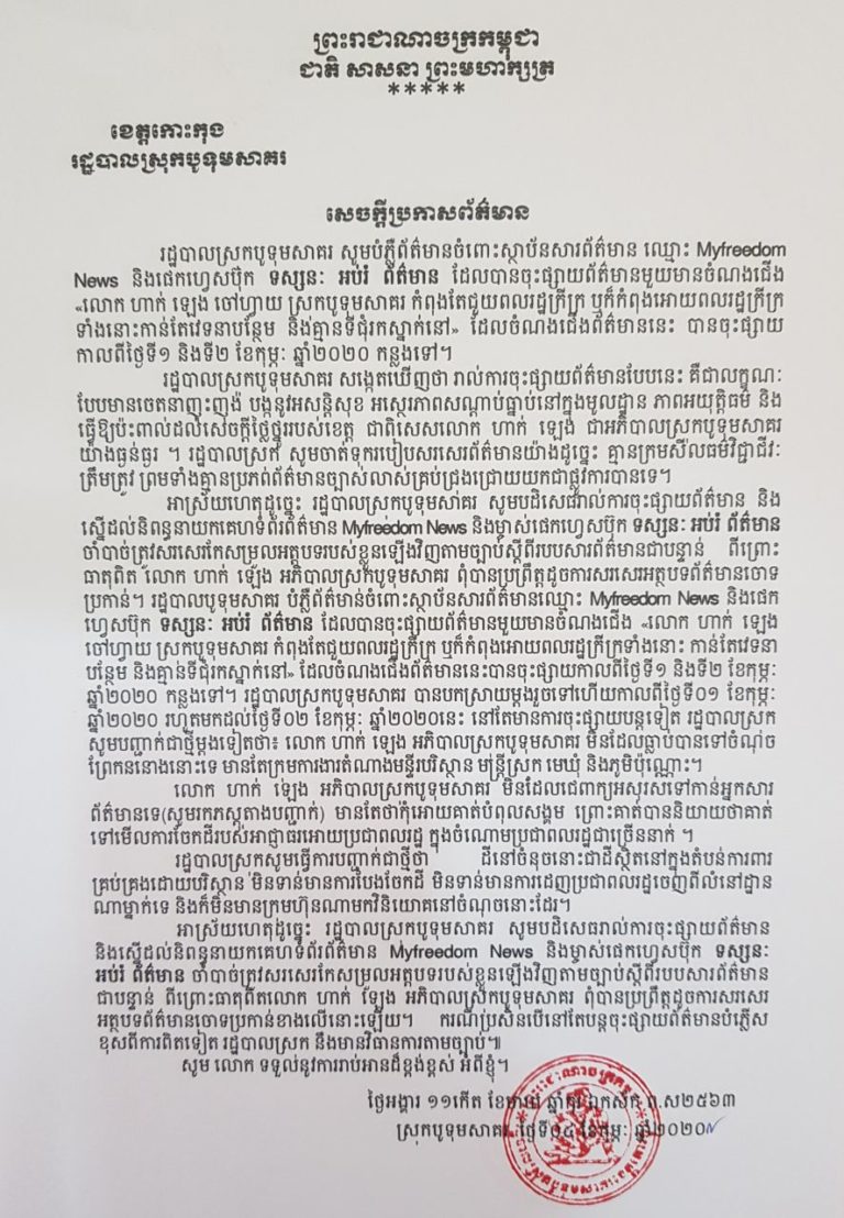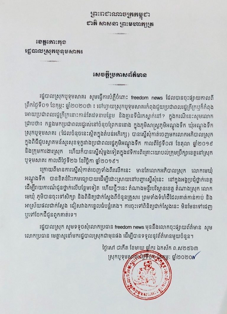 រដ្ឋបាលស្រុកបូទុមសាគរ សូមជម្រាបជូននូវសេចក្តីប្រកាសព័ត៌មាន ស្រាយបំភ្លឺចំពោះសារព័ត៌មាន freedom news និងផេកហ្វេសប៊ុក ទស្សនៈ អប់រំ ព័ត៌មាន