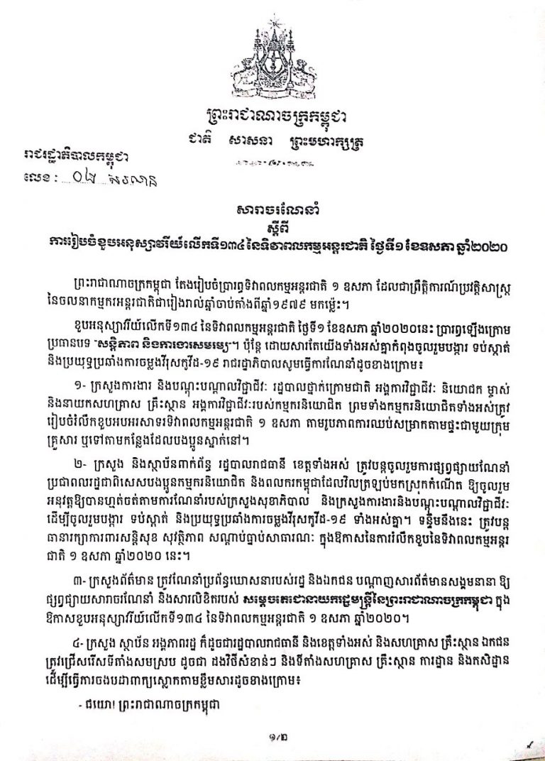 សារាចរណែនាំ ស្តីពីការរៀបចំខួបអនុស្សាវរីយ៍លើកទី១៣៤ នៃទិវាពលកម្មអន្តរជាតិ ថ្ងៃទី១ ខែឧសភា ឆ្នាំ២០២០