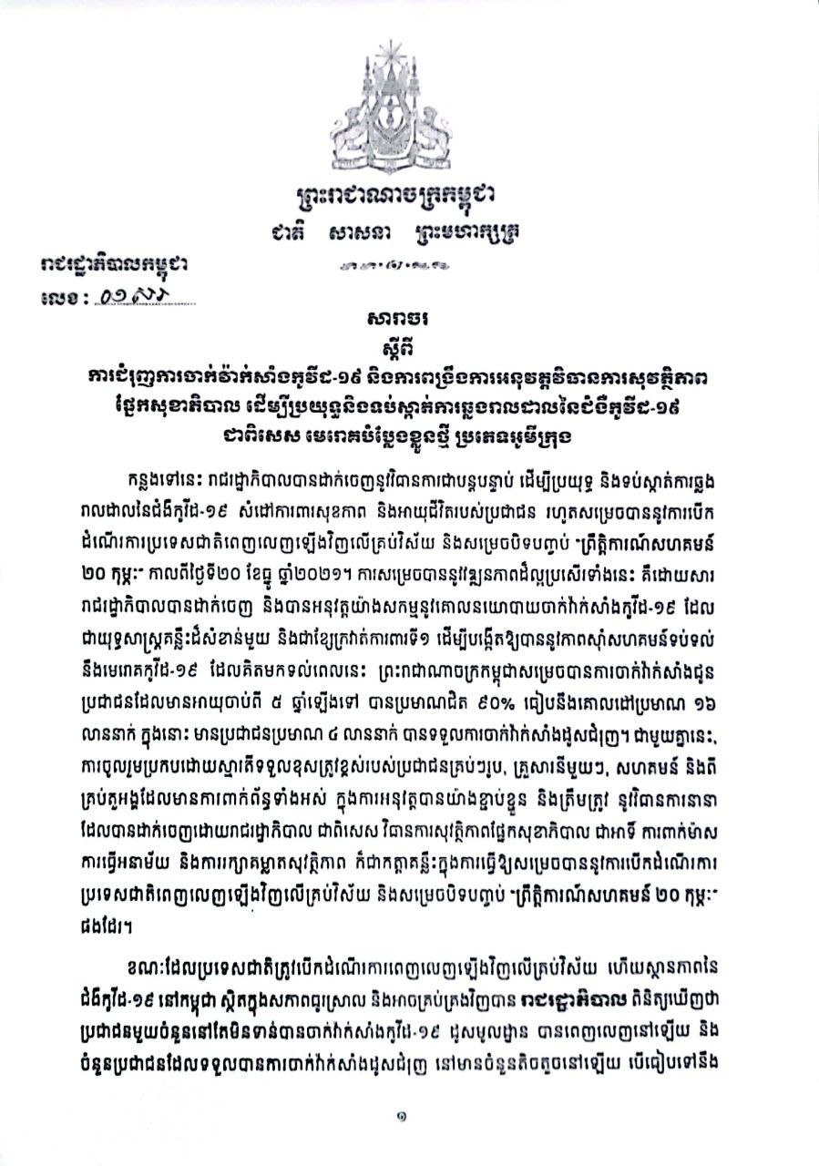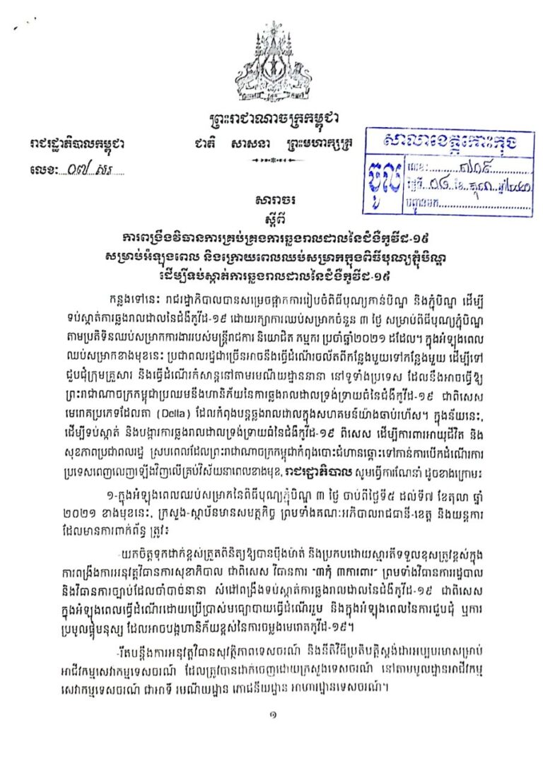 សារាចរ ស្តីពីការពង្រឹងវិធានការគ្រប់គ្រងការឆ្លងរាលដាលនៃជំងឺកូវីដ-១៩ សម្រាប់កំឡុងពេល និងក្រោយពេលឈប់សម្រាកក្នុងពិធីបុណ្យភ្ជុំបិណ្ឌ ដើម្បីទប់ស្កាត់ការឆ្លងរាលដាលនៃជំងឺកូវីដ-១៩