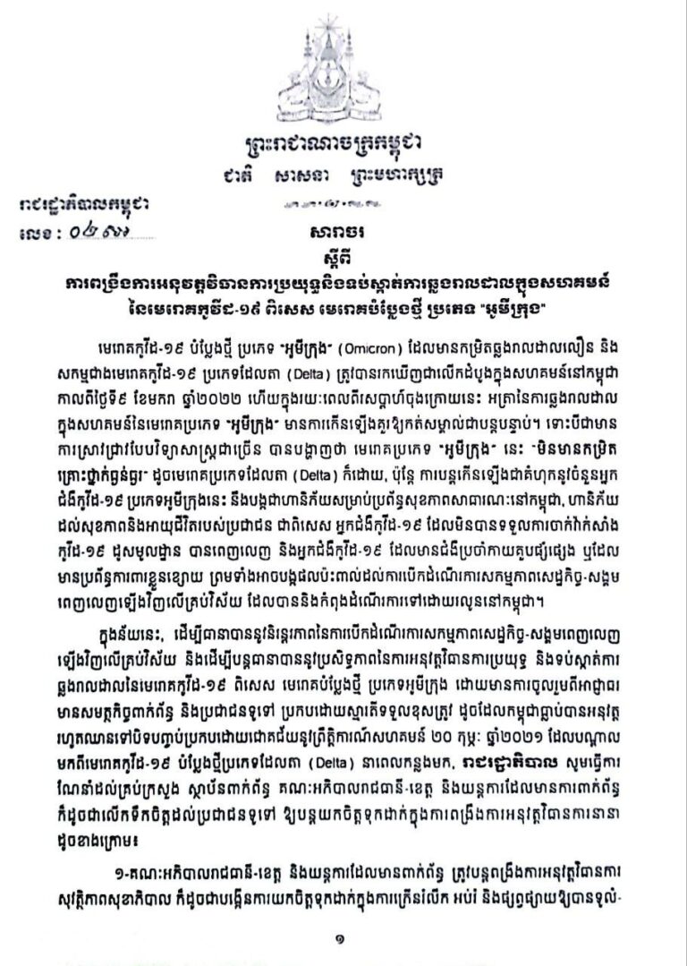 សារាចររបស់រាជរដ្ឋាភិបាល ស្តីពីការពង្រឹងការអនុវត្តវិធានការប្រយុទ្ធនិងទប់ស្កាត់ការឆ្លងរាលដាលក្នុងសហគមន៍ នៃមេរោគកូវីដ-១៩ ពិសេស មេរោគបំប្លែងថ្មី ប្រភេទ “អូមីក្រុង”