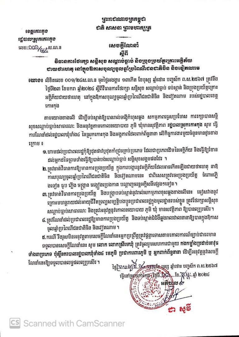 សេចក្តីណែនាំ ស្តីពី វិធានថែរក្សាសន្តិសុខ សណ្តាប់ធ្នាប់ និងប្រុងប្រយ័ត្នគ្រោះអគ្គីភ័យ ជាយថាហេតុ នៅក្នុងឱកាសបុណ្យចូលឆ្នាំប្រពៃណីជនជាតិចិន និងវៀតណាម