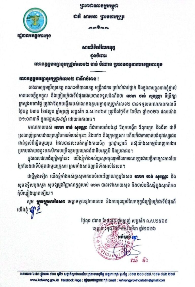 តាងនាមក្រុមប្រឹក្សាខេត្ត គណៈអភិបាលខេត្ត មន្ត្រីរាជការ គ្រប់លំដាប់ថ្នាក់ និងក្នុងនាមខ្លួននាងខ្ញុំផ្ទាល់ មានសេចក្ដីក្ដុកក្ដួល និងក្រៀមក្រំជាទីបំផុតដោយបានទទួលដំណឹងថា លោក ចាន់ សុវណ្ណា ទីប្រឹក្សា ក្រសួងមហាផ្ទៃ ត្រូវជាឪពុកបង្កើតរបស់លោកឧត្តមអគ្គានុរក្សថ្នាក់លេខ២ បានទទួលមរណភាពកាលពី ថ្ងៃចន្ទ ៦រោច ខែផល្គុន ឆ្នាំម្សាញ់ សប្តស័ក ព.ស.២៥៦៩ ត្រូវនឹងថ្ងៃទី៩ ខែមីនា ឆ្នាំ២០២៦