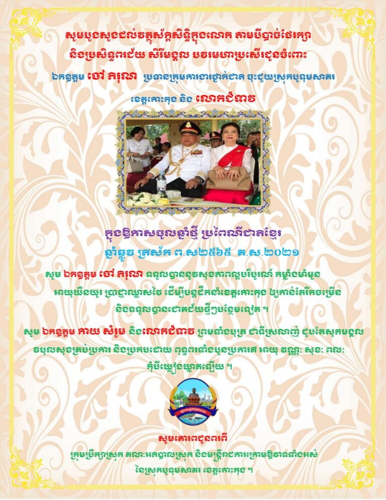 សារគោរពជូនពរ ឯកឧត្តម ចៅ ភិរុណ ប្រធានក្រុមការងារថ្នាក់ជាតិ ចុះជួយស្រុកបូទុមសាគរ និងលោកជំទាវ ក្នុងឱកាសពិធីបុណ្យចូលឆ្នាំថ្មី ប្រពៃណី ឆ្នាំឆ្លូវ ទោស័ក ព.ស.២៥៦៤ ឈានចូល ត្រីស័ក ព.ស.២៥៦៥
