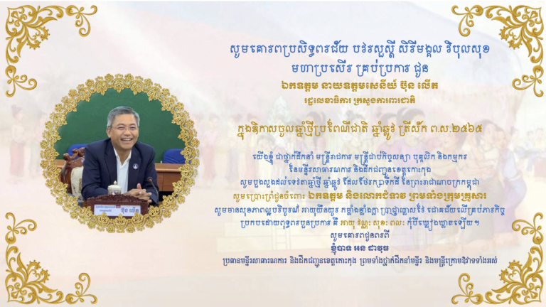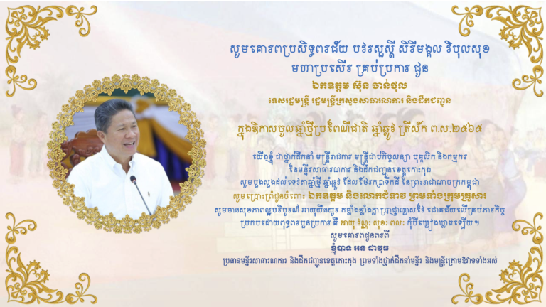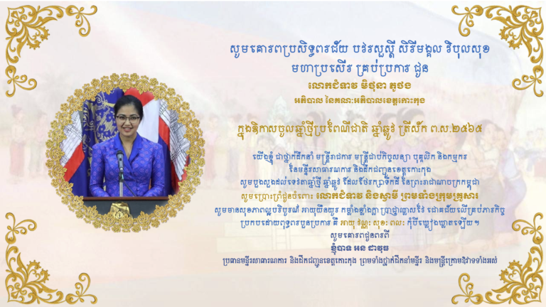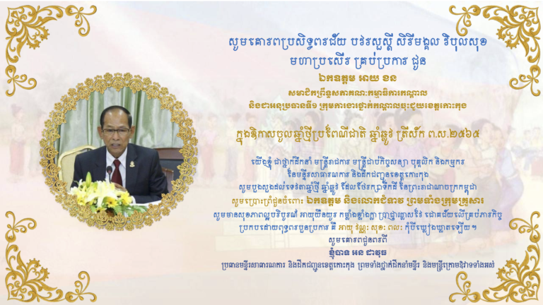 សារគោរពជូនពរ លោកជំទាវ កិត្តិសង្គហបណ្ឌិត ម៉ែន សំអន ឧបនាយករដ្ឋមន្ត្រី រដ្ឋមន្ត្រីក្រសួងទំនាក់ទំនងជាមួយរដ្ឋសភា ព្រឹទ្ធសភា និងអធិការកិច្ច ក្នុងឱកាសពិធីបុណ្យចូលឆ្នាំថ្មី ប្រពៃណី ឆ្នាំឆ្លូវ ទោស័ក ព.ស.២៥៦៤ ឈានចូល ត្រីស័ក ព.ស.២៥៦៥ សូមគោរពជូនពរ ពីរដ្ឋបាលខេត្តកោះកុង និងបងប្អូនប្រជាពលរដ្ឋទូទាំងខេត្តកោះកុង