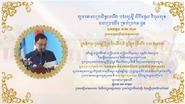 មន្ទីរសាធារណការ និងដឹកជញ្ជូនខេត្តកោះកុង សូមគោរពប្រសិទ្ធពរជ័យ បវរសួស្តី សិរីមង្គល វិបុលសុខ មហាប្រសើរ គ្រប់ប្រការ ជូន ឯកឧត្តម កាយ សំរួម ប្រធានក្រុមប្រឹក្សាខេត្តកោះកុង