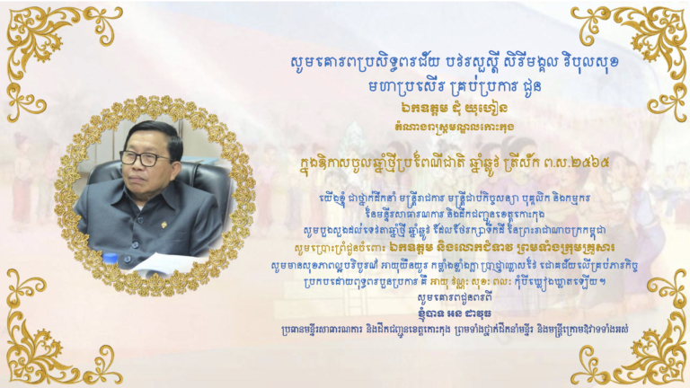 មន្ទីរសាធារណការ និងដឹកជញ្ជូនខេត្តកោះកុង សូមគោរពប្រសិទ្ធពរជ័យ បវរសួស្តី សិរីមង្គល វិបុលសុខ មហាប្រសើរ គ្រប់ប្រការ ជូន ឯកឧត្តម នាយឧត្តមសេនីយ៍ ប៊ុន លើត រដ្ឋលេខាធិការ ក្រសួងការពារជាតិ