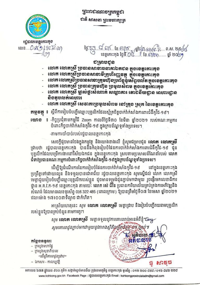 ថ្នាក់ដឹកនាំ និងមន្ត្រីរាជការគ្រប់ជាន់ថ្នាក់ នៃមន្ទីរឧស្សាហកម្ម វិទ្យាសាស្រ្ត បច្ចេកវិទ្យា និងនវានុវត្តន៍ខេត្តកោះកុង បានចាក់វ៉ាក់សាំងការពារជំងឺកូវីដ-១៩ លើកទី១