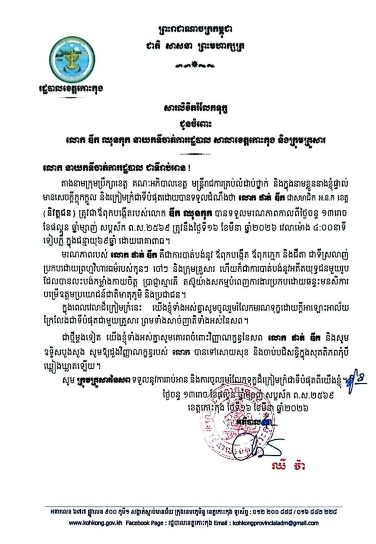 សារលិខិតរំលែកទុក្ខ ជូនចំពោះលោក ឌឹក ឈុនកុក នាយកទីចាត់ការរដ្ឋបាល សាលាខេត្តកោះកុង និងក្រុមគ្រួសារ