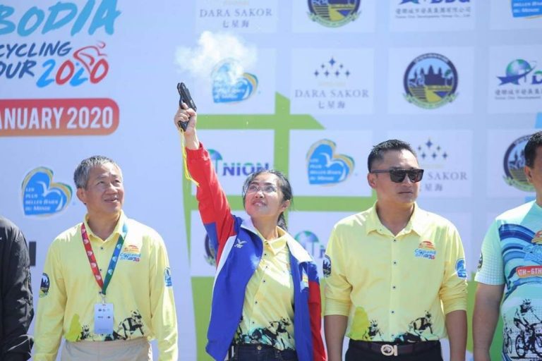 ការបាញ់កាំភ្លើងបើកការប្រណាំងកង់ពិភពលោកនេះ ត្រូវបានធ្វើឡើងក្រោមវត្តមានលោកជំទាវ មិថុនា ភូថង អភិបាល នៃគណៈអភិបាលខេត្តកោះកុង ឯកឧត្តម វ៉ាត់ ចំរើន អគ្គលេខាធិការនៃគណៈកម្មាធិការអូឡាំពិកកម្ពុជា (NOCC) នៅចំណុចវង្វង់មូលព្រឹទ្ធាចារ្យ សាយ ភូថង។