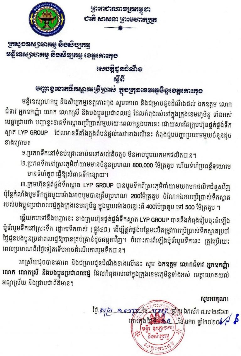 សេចក្តីជូនដំណឹង របស់មន្ទីរឧស្សាហកម្ម និងសិប្បកម្ម ខេត្តកោះកុង ស្តីពីបញ្ហាខ្វះខាតទឹកស្អាតប្រេីប្រាស់ ក្នុងក្រុងខេមរភូមិន្ទ ខេត្តកោះកុង។